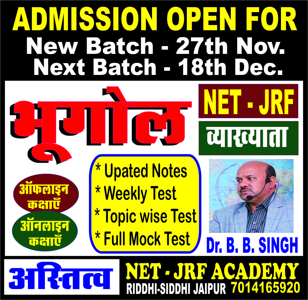 Admission Open for New Batch of Geography Subject for NET - JRF (June 2024 Exam) and RPSC Lecturer Exam (School and College) from 27th November and 18 December. For more details call or whatsapp on 7014165920.