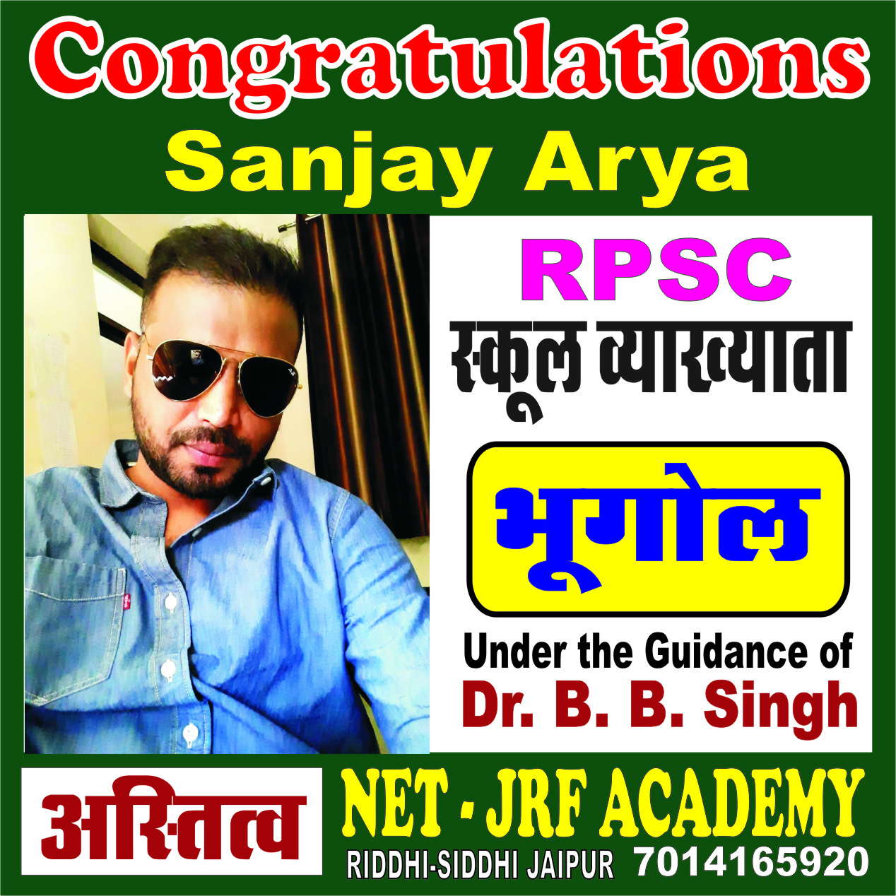 Congratulation Sanjay Arya, selected in RPSC - School Lecturer Examination - 2022 in Geography Subject, under the Guidance of Dr. B. B. Singh Sir.